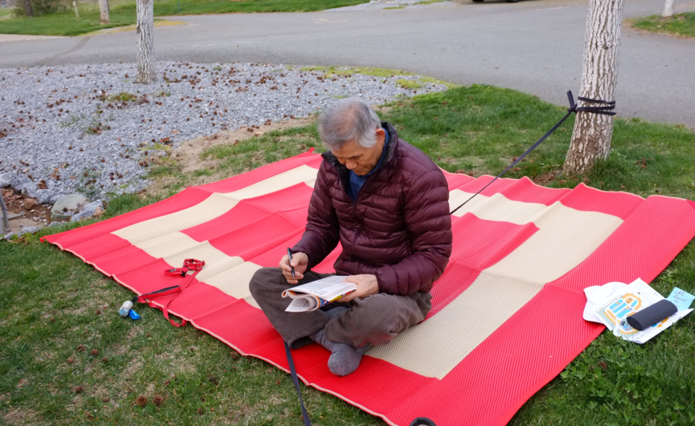 A friendly employee named Andrew guided us to our campsite in his golf cart. When we got to number 31, the Bambi set up began. I hooked up the power, water, sewer connections. Tried the cable but it didn’t work. I put wheel chocks down to prevent Bambi from rolling back. Then unhitched the Toureg and set up a mat for Apa to keep himself entertained by playing Sodoku.