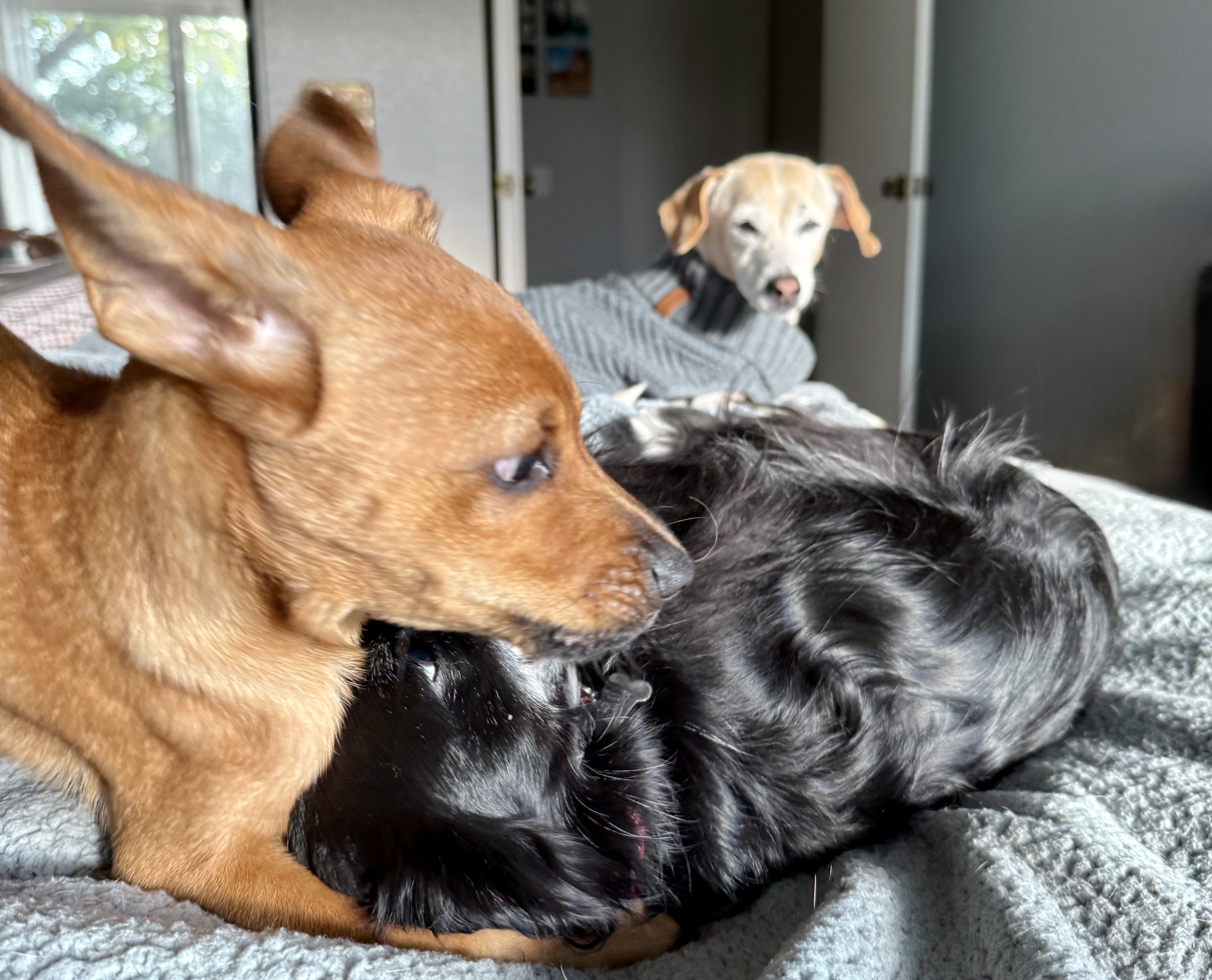 Lonnie and JoJo have gotten into a routine of playing on the bed in the morning. Butters is deaf, so she doesn’t know what’s going on and is in a deep sleep. Jay and I have taken turns using our bodies as a protective wall to shield Butters while the other two play.
